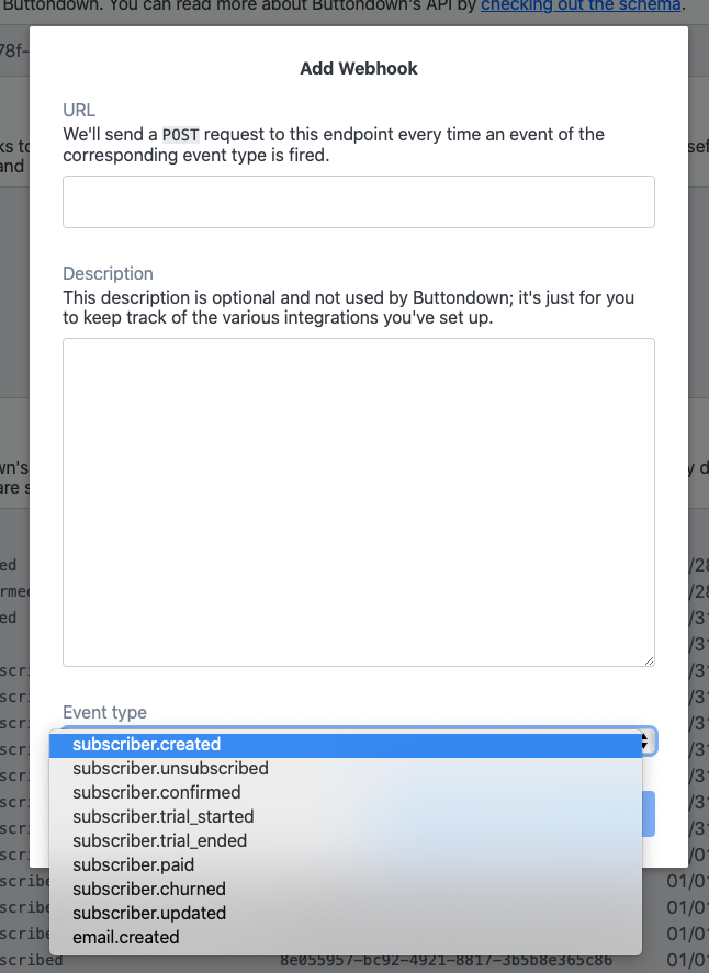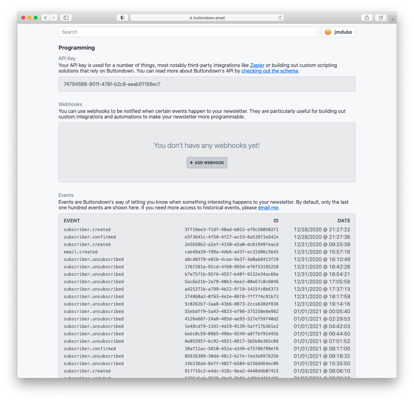 So, if you’re not interested in supercharging your newsletter (and I don’t mean that in a bad way at all: none of my newsletters are using webhooks!) feel free to ignore this. But if you’re interested in seeing how to better integrate Buttondown into your stack, let’s dive in!