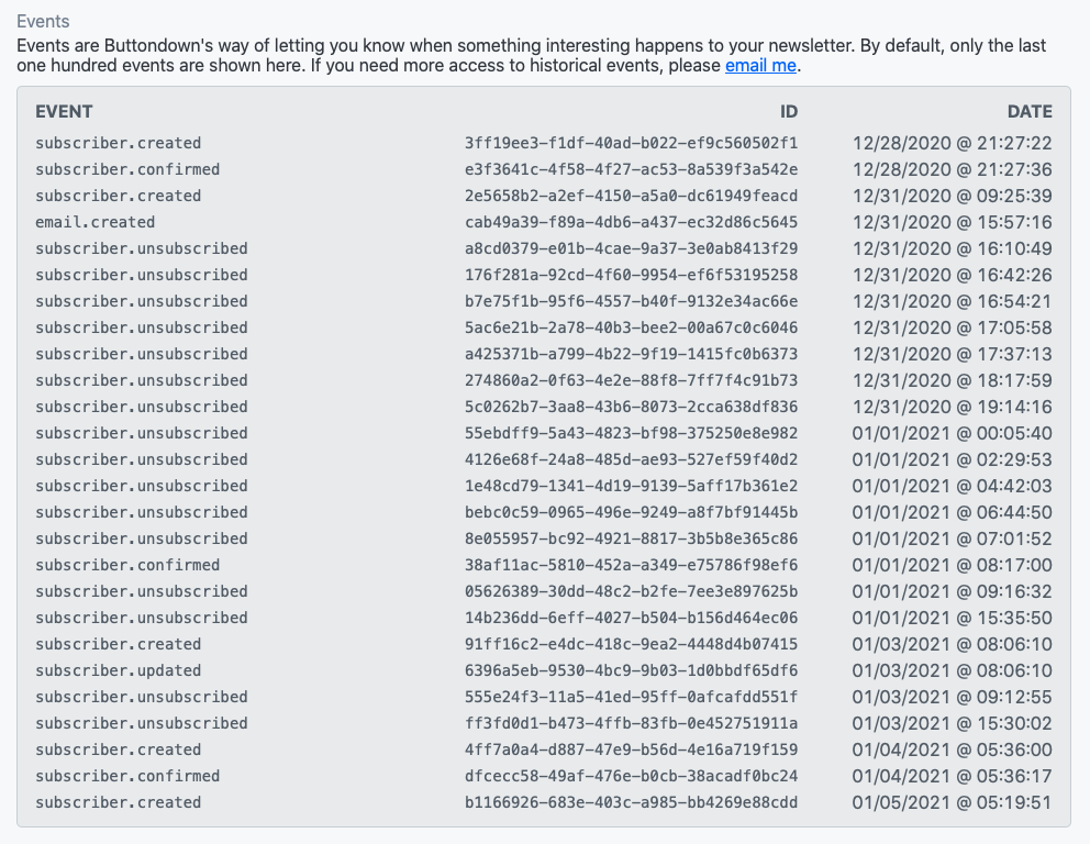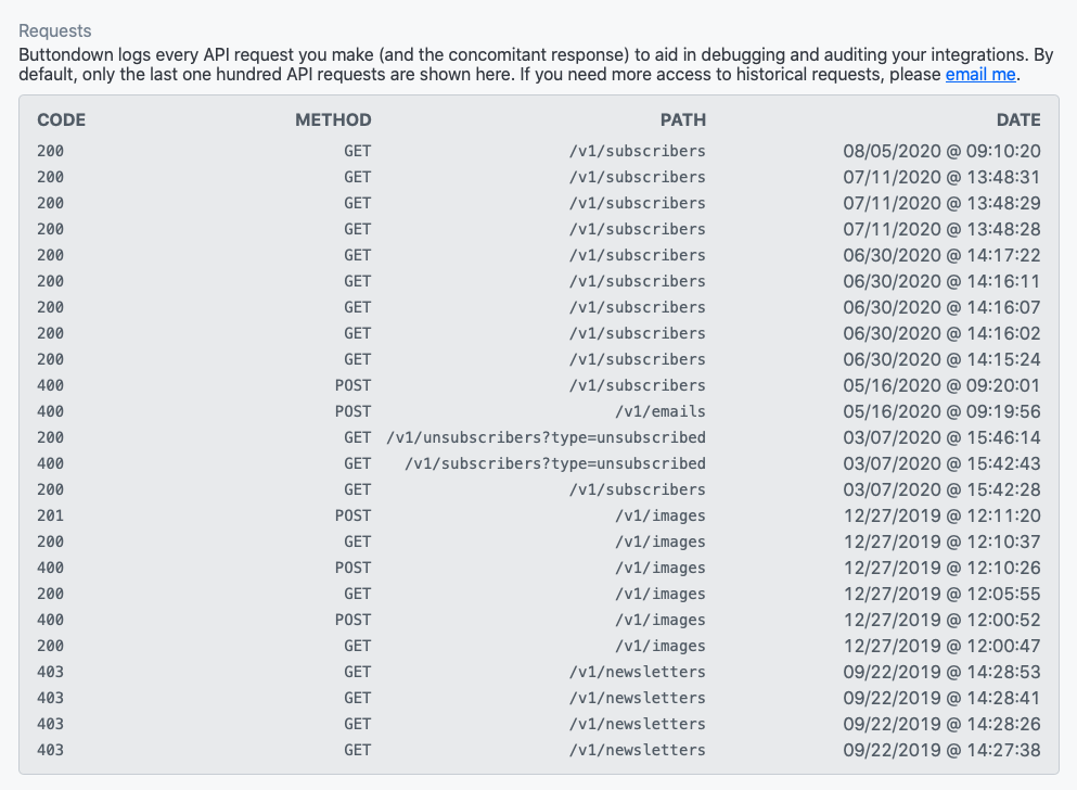 Lastly, if you’ve wired together an API integration with Buttondown, you get a nice administrative view of all of your previous requests along with latency, success, and response information. You can use this to debug any problems you have with your integration.