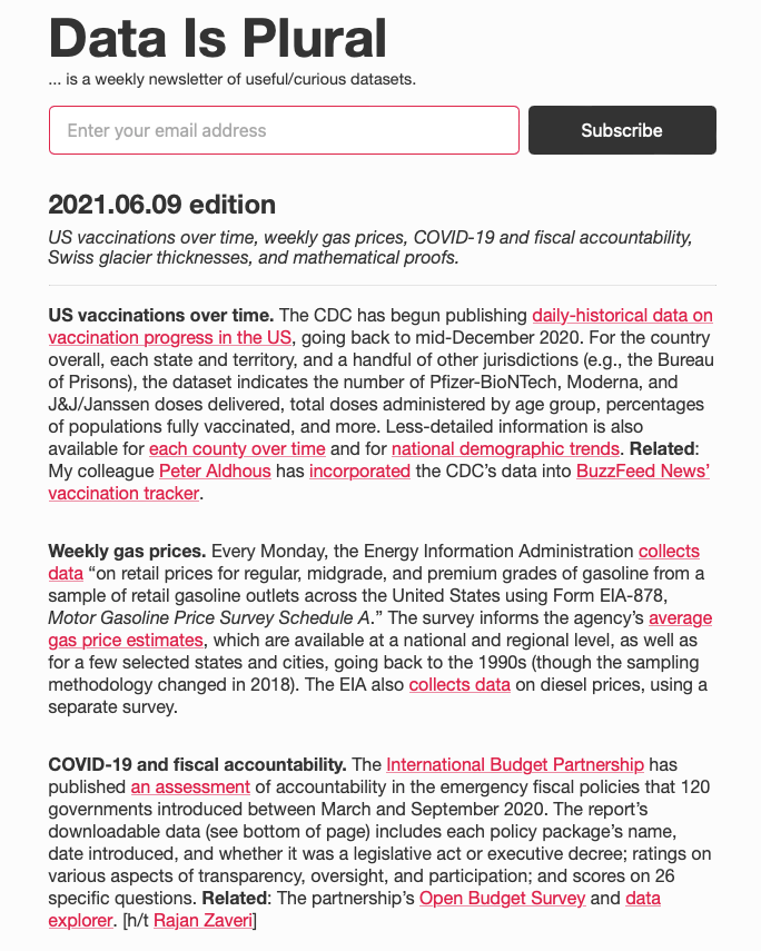 I started writing Data Is Plural in late 2015, to scratch a proverbial itch. At the time, it seemed there wasn’t a great way to learn about public datasets. There were giant data portals, but they felt overwhelming and often lacked key context. There were also smaller, more niche data portals, but spread all across the web. And there were one-off blog posts here and there, highlighting a few gems.