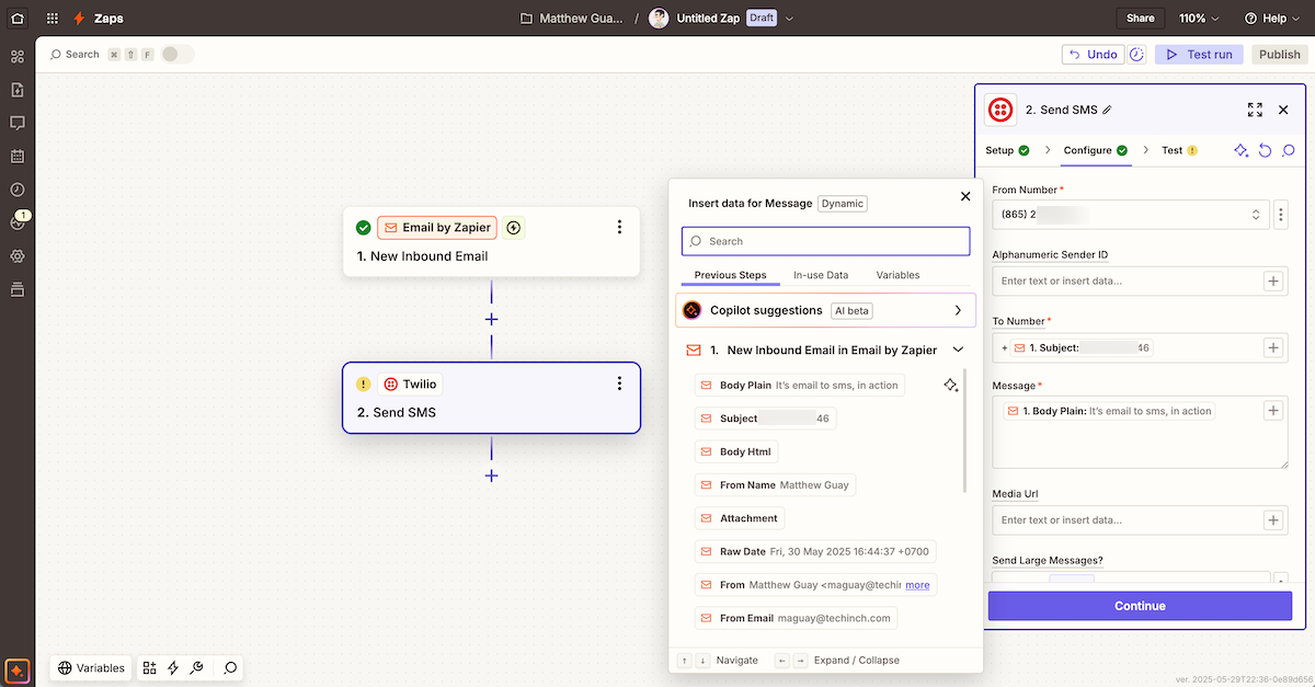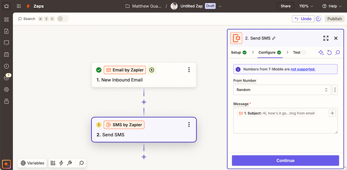 Then add a Twilio step to send an SMS. Add your email subject to Twilio’s To line, your email body to the Message field, then test and turn on your automation. Now, whenever you email a phone number and message to your Zapier email address, your recipient will get an SMS.