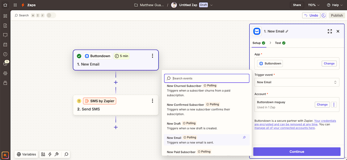 Here’s how it works. You’ll set up an automation that waits for an email. In Zapier (the simplest, with its Buttondown integration), start the automation with the Email by Zapier trigger, customize the email, then send a test message to that new @zapiermail.com address.