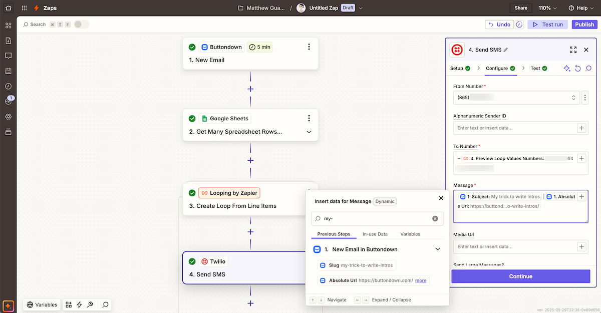 Finally, add your Twilio Send SMS action, this time using the phone number from the Loop action in the To field, and details from Buttondown in the Message. You could have the SMS include your newsletter subject and a link to read the email on Buttondown’s site—or could tweak the message any way you want.