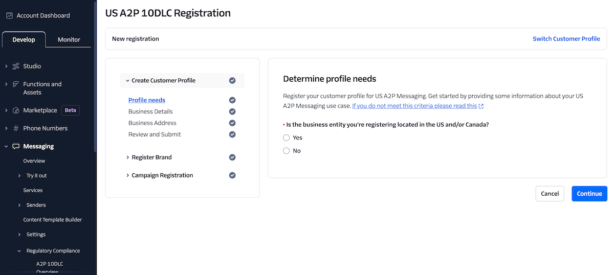 Twilio's application process for a US A2P 10DLC registration