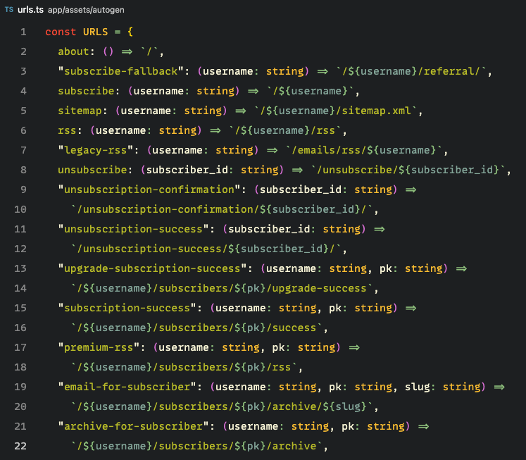 But there are many parts which I suspect would be useful as open source projects, and I'm excited to announce the first of many such initiatives: the dryly (but descriptively!) named django-typescript-routes.