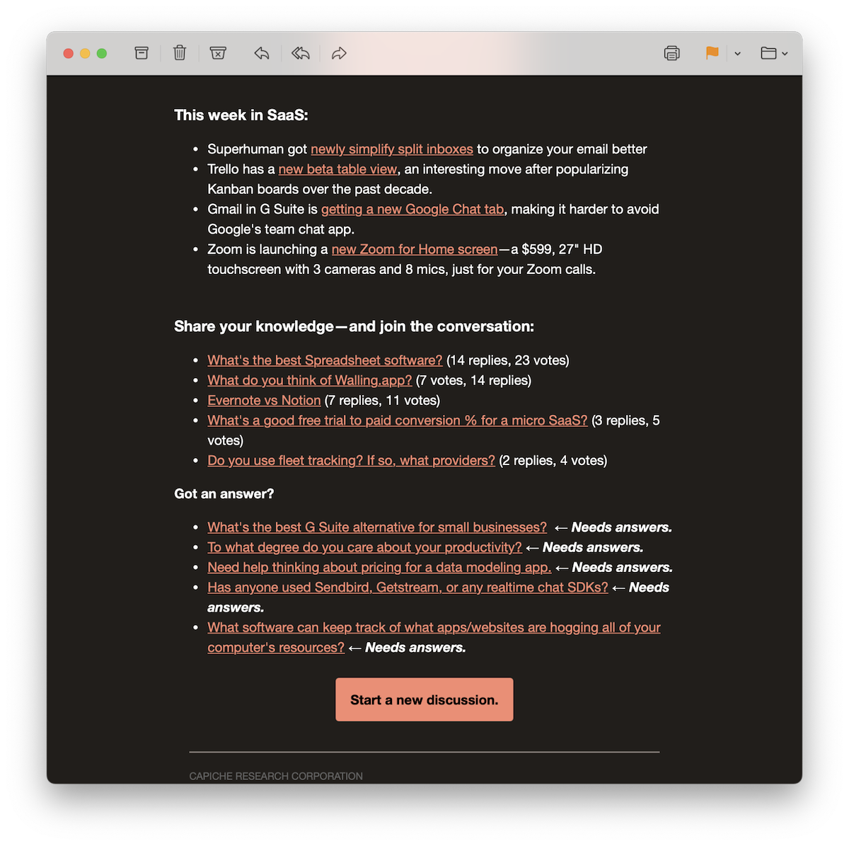 That’s how fledgling software community Capiche built its active user base. Alongside the tech news of the week and product announcements, the emails included top community discussions of the week and new, as-yet unanswered questions from the community. “It wasn’t uncommon for community members to disappear for a month, before showing back up to join in discussions,” says founding editor Matthew Guay. “The email newsletter pulled people back in—and directed readers to the conversations that needed answers most to drive community growth.”