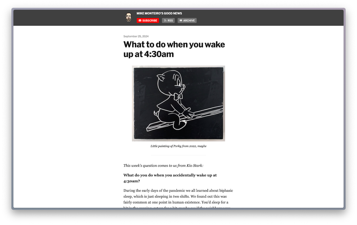 Like Mike Monteiro’s Good News, a self-contained community in a newsletter. Each email closes with an “🙋 Got a question for me? Ask it!” CTA. Then, sure enough, next week’s email starts with a “This week’s question comes to us from...” opening, followed by Mike’s riffs on the idea. Thus grew Mike’s eclectic collection of ideas around how to relax, how many hobbies are too many, how to become wise, how to talk to animals, and more. So much more.