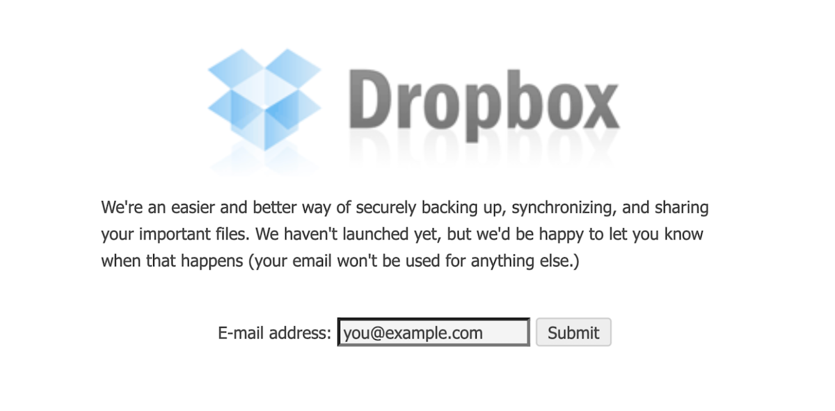 Dropbox launched in 2007 with little more than a blue box, two sentences of copy, and an email signup form. That, paired with a video promoted on Hacker News, was enough to get their first 5,000 signups. Another video went viral on Digg and took that pre-launch list to 75k subscribers.