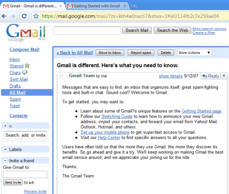 That was followed by a “Gmail is different. Here’s what you need to know.” email that arrived when you first opened your new Gmail inbox. And that wrapped up the Gmail invite email list’s duty.