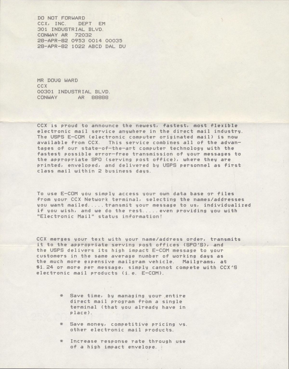 E-COMs could be “Single Address Messages” with a letter for a single recipient, “Common Text Messages” with a single bulk letter intended for multiple recipients, or “Text Insertion Messages” with form letters blended with text to be inserted into the message for an early take on mail merge. The Univac would print your emails, then postal staff would fold them, stuff them in envelopes, and send them on their way.