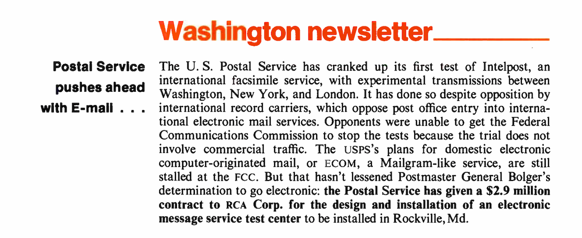 “Postal Service pushes ahead with E-mail,” opined the Electronics journal headline in June of 1979, as the case worked its way through the courts, inadvertently using the phrase “e-mail” for what the Oxford English Dictionary believes is the first time.