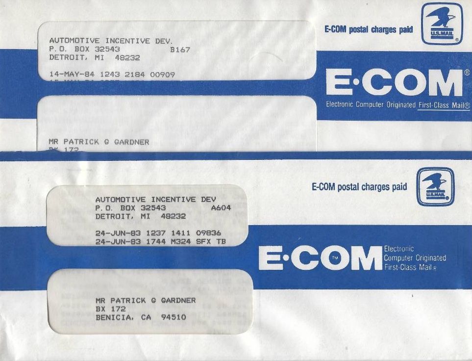 If E-COM wasn’t worth the trouble for companies like Shell, it clearly was worth it to a tiny handful of companies that valued the credibility that E-COM’s official, blue-and-white envelope lent. “The distinctive look of an E-COM letter carries a lot of weight with recipients,” advertised the USPS, and clearly direct mailers took the hint. Automotive Incentive’s letters were so common, of the less-than-a-dozen surviving E-COM envelopes we could find online, two of them were sent by Automotive Incentive.
