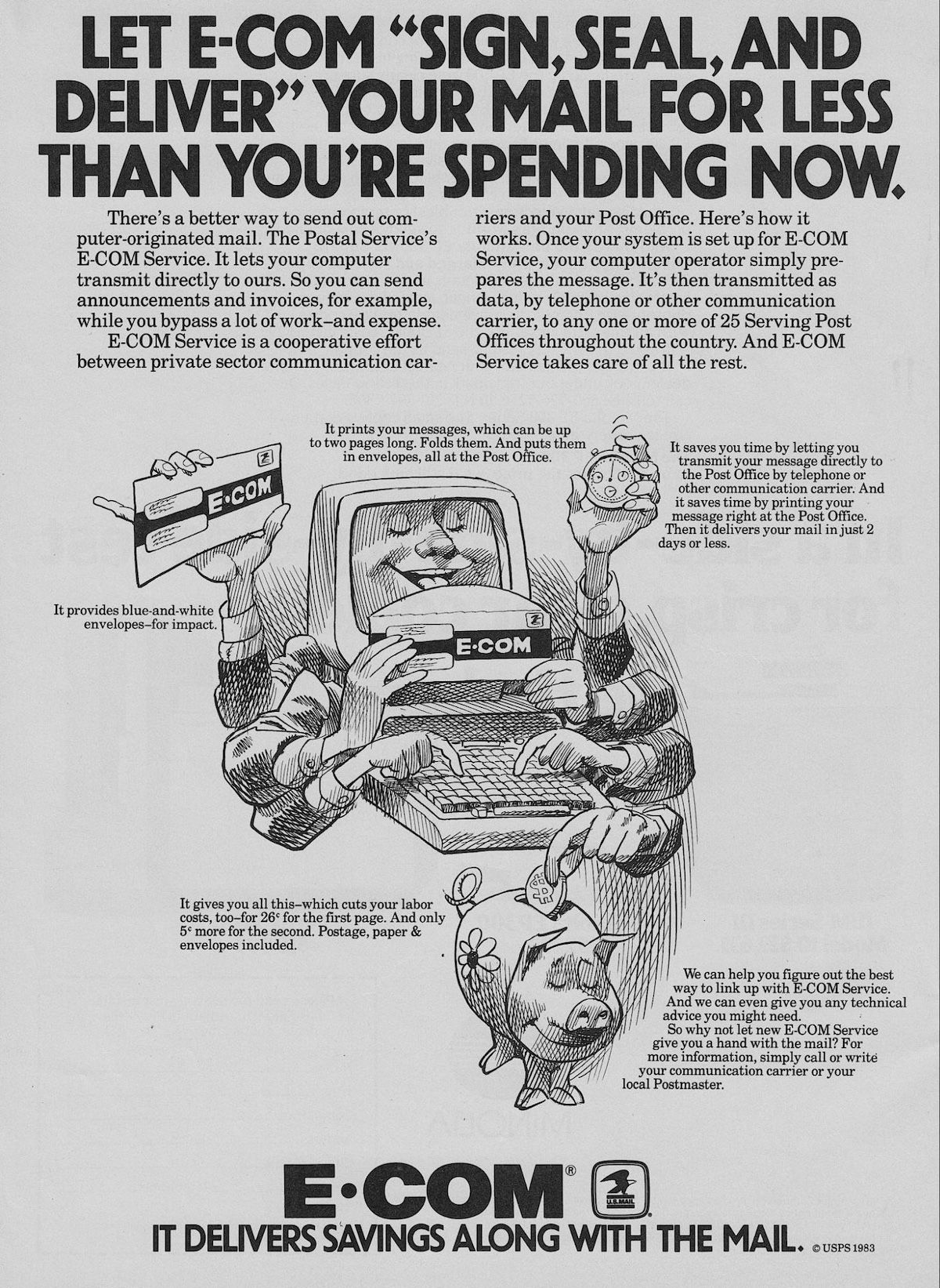 Some early adopters braved the challenges and took the Post Office up on its offer. With their official-looking, blue-and-white envelopes, “an E-COM letter carries a lot of weight with recipients,” advertised the USPS. Bank of America used E-COM partly to expedite overdue payment notifications, partly because the envelope “draws attention,” said a bank official.