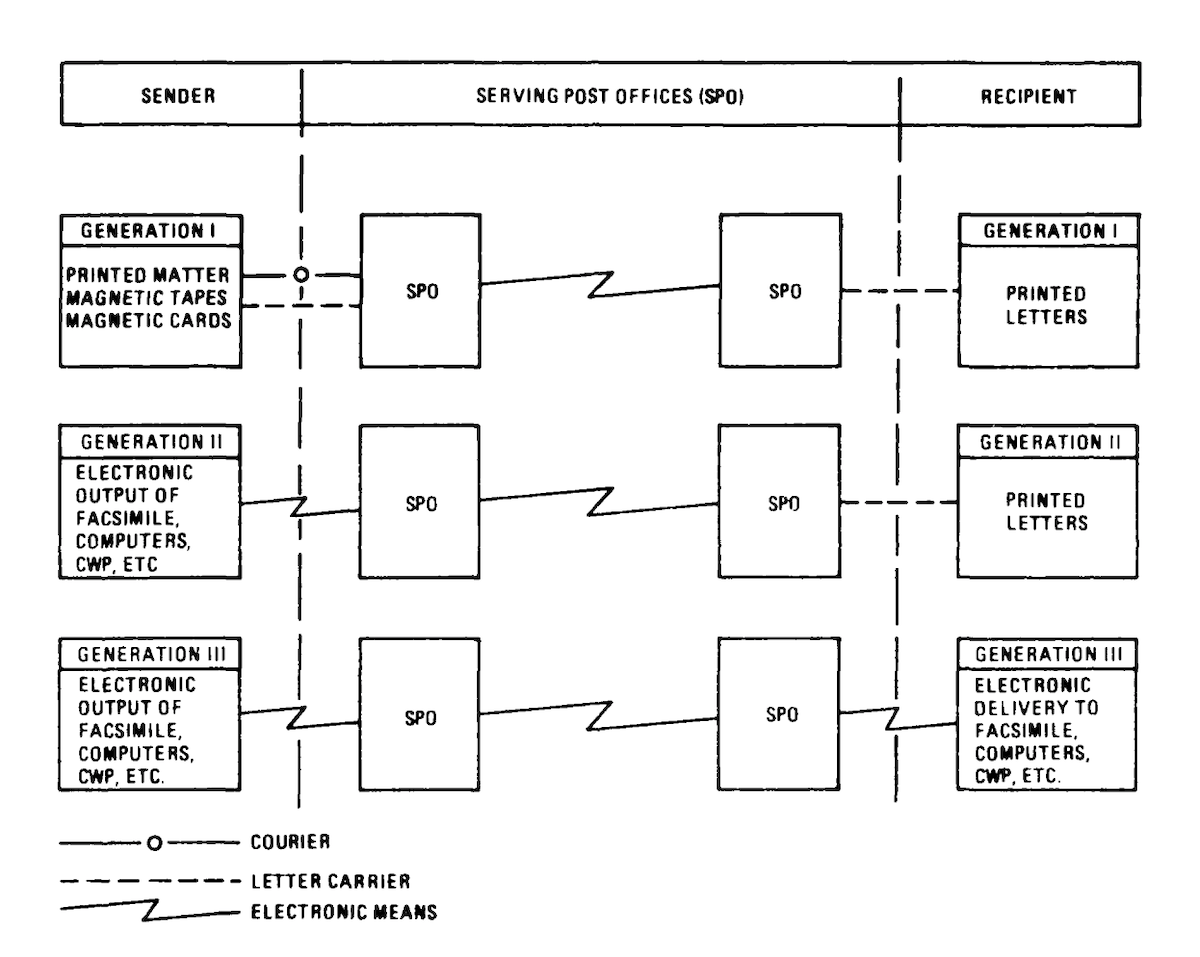 And, perhaps, that volume would be easier to hit, imagined the Post Office, if Congress would authorize an expanded monopoly. The Postal Service proposed it should have “monopoly over delivery of hard copy associated with electronic messages,” said Postal Rate Commission chairman Janet Steiger in December 1978, carefully defined so Western Union, say, could still deliver telegrams while the Postal Service could have a monopoly over delivering printed email messages. “The Postal Service intends to stand on its right to be the sole delivery agent for such mail when delivery is in hard-copy form,” noted a Defense Communications report. And it was trialing sending electronic messages itself, without print—expanding its mandate.