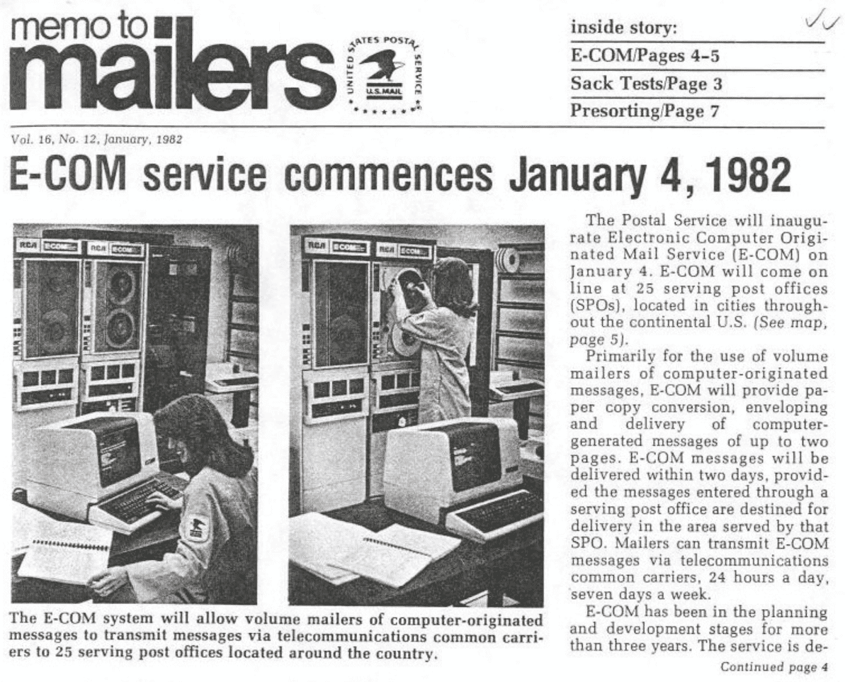 Yet, at least the system was finally ready to launch. “We are very proud of this milestone in the history of the Postal Service and pleased to share this occasion with you through this message,” wrote Postmaster General William Bolger in the first E-COM on January 4, 1982.