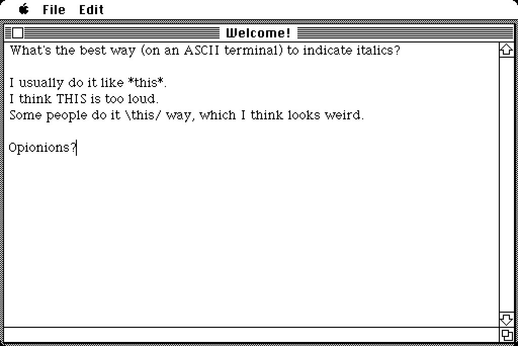 “What’s the best way (on an ASCII terminal) to indicate italics?,” asked Jack Applin in a 1983 Usenet email discussion, six months before Steve Jobs would unveil the first Macintosh.