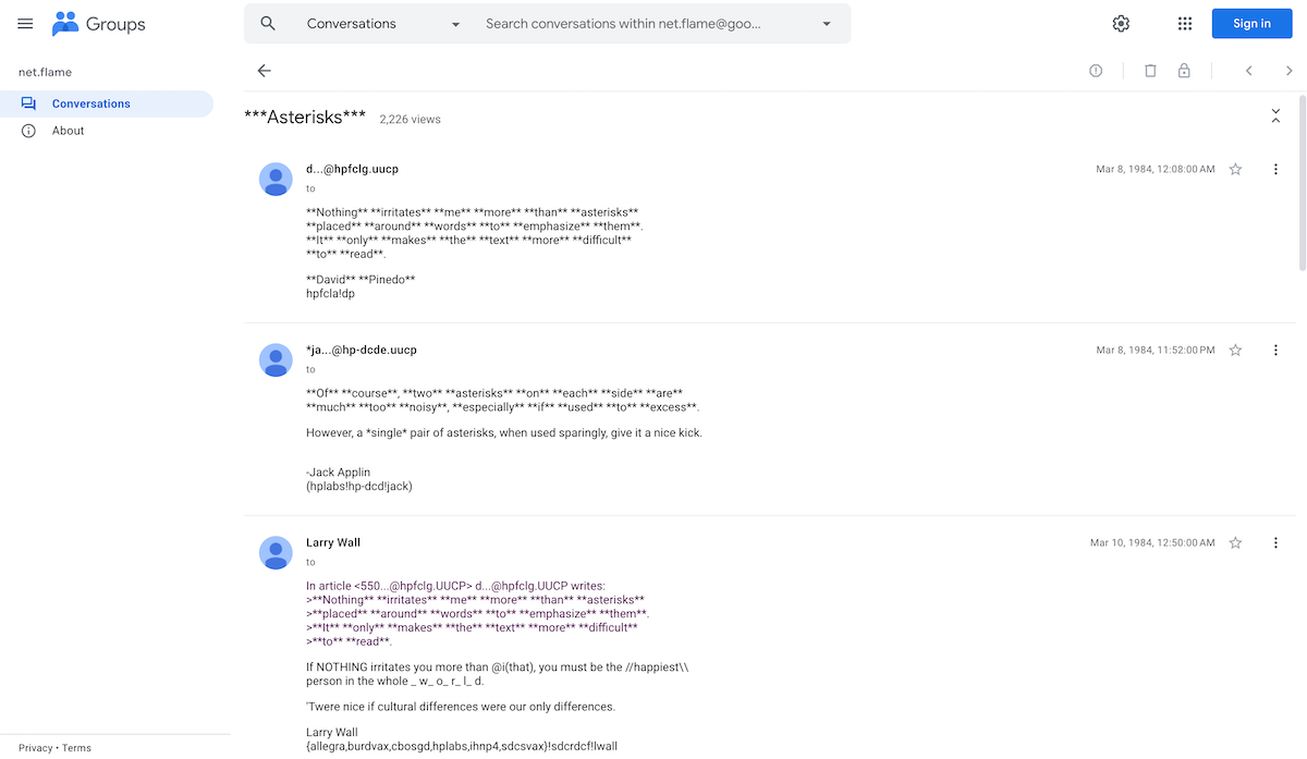 **Nothing** **irritates** **me** **more** **than** **asterisks** **placed** **around** **words** **to** **emphasize** **them**, typed David Pinedo in a Usenet email discussion on March 8, 1984—two months after the first Macintosh was unveiled.