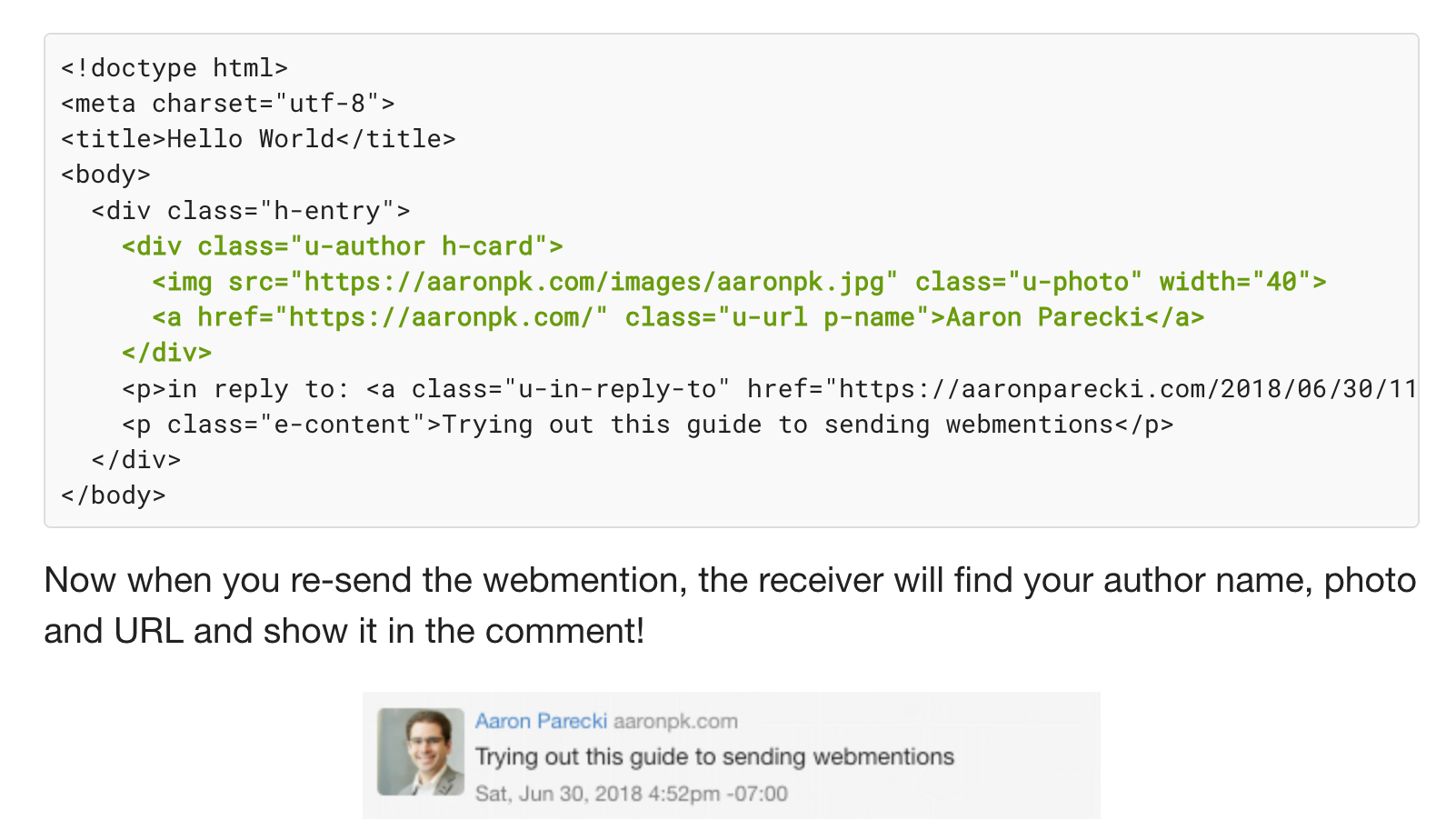 Links on their own don’t tell you all that much, so Webmentions expanded what could be included. You could include microformats like h-entry and u-author in your Webmention copy, to perhaps share a like or dislike, include the ID of a specific comment you’re replying to, include your name and avatar, and more. And you could include URL fragments to link directly to a specific part of a page, for Medium-style inline comments.